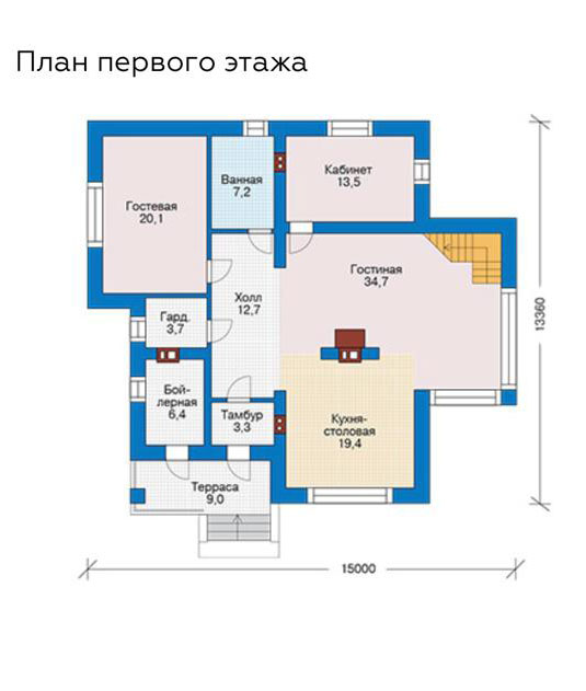 - на 1-м этаже дома располагаются холл, кухня-гостиная, 2 спальни, санузел, гардероб, бойлерная с отдельным входом, выход на задний двор.